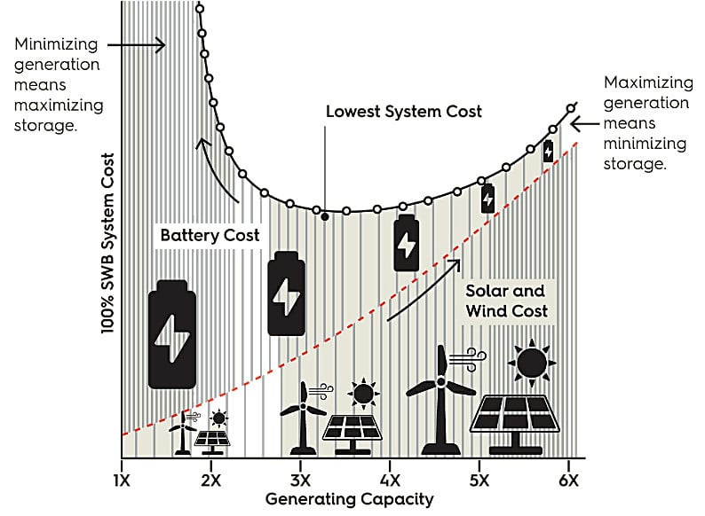 The graphic on the left illustrates the system cost for various combinations of solar, wind, and battery usage in energy production. According to the authors, this SWB system, as they call it, can generate three to five times more energy than the existing extractive system in place anywhere in the world. It is also the most affordable option. They came to these conclusions after having modeled regions as diverse as India, Brazil, Scotland, Alaska, and Germany. Additionally, “there is no need for any material inputs to keep the system running and no toxic outputs whatsoever. . . . We have the financial resources, there are no material constraints, and no technology breakthroughs are needed.”