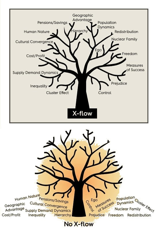 In our world, scarcity is created by design because the only asset that matters is financial capital. Resources that could be publicly available are privately owned for the sake of profit, thus pushing for ever more resources to exploit in a dog-eat-dog market competition. In a world where the only external input is energy from the sun, which is boundless, non-excludable, and non-depletive, this X-flow ends. As mentioned by the authors in the previous chapter, “When the key inputs needed to fuel the production system are embodied within it (land, labor, and capital), there’s little role for free market capitalism or, in fact, any other extractive economic model. . . . The relationship between supply and demand breaks down in a world where supply is boundless, regardless of demand. Cost and price are also extractive concepts – with everything the system needs embodied within it, there’s virtually no cost and, with ownership embodied, no price.”